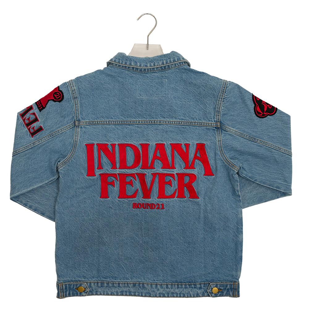 Classic denim with a supernatural twist. The Stranger Things DemorGame Denim Jacket unites two icons born in Indiana, the boundary-pushing legacy of Stranger Things and the unstoppable momentum of the Indiana Fever. This heavyweight washed denim jacket is anything but ordinary, loaded with layered meaning and standout detail. Embroidered patches bring the story to life, from a Demogorgon graphic and a bold “001” tribute to Eleven, to Indiana Fever and Round21 designs that honor the spirit of Hoosier grit. The oversized “INDIANA FEVER” red text on the back makes a statement from every angle, while stacked sleeve graphics and woven front patches push the energy into overdrive. Whether you're channeling your inner Eleven or riding the Fever wave courtside, this jacket blends sport, street, and story into one unforgettable layer.
