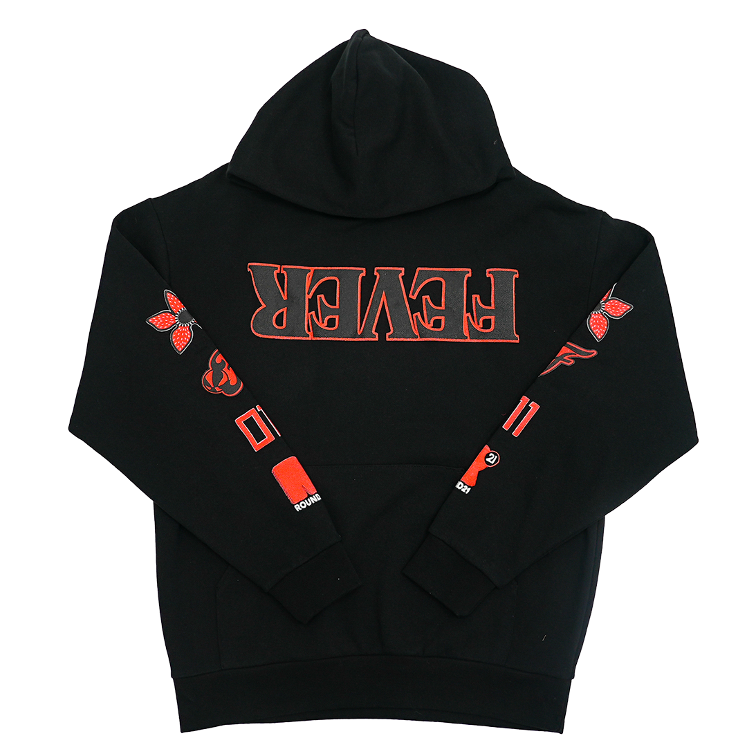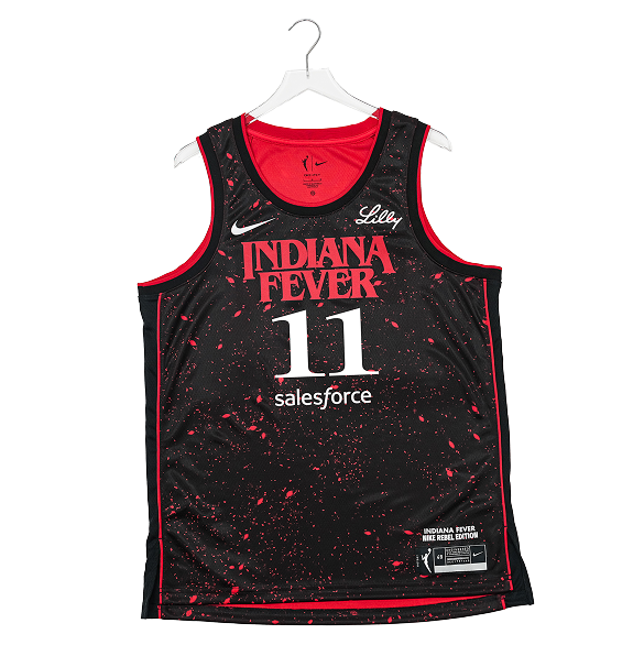 The limited-edition jersey – on sale now – reimagines the Fever’s classic look with a dark, retro twist featuring eerie red and black hues, vintage Stranger Things font, Demogorgon claw accents, and “011” on the waistband, referencing the series’ beloved character, Eleven.