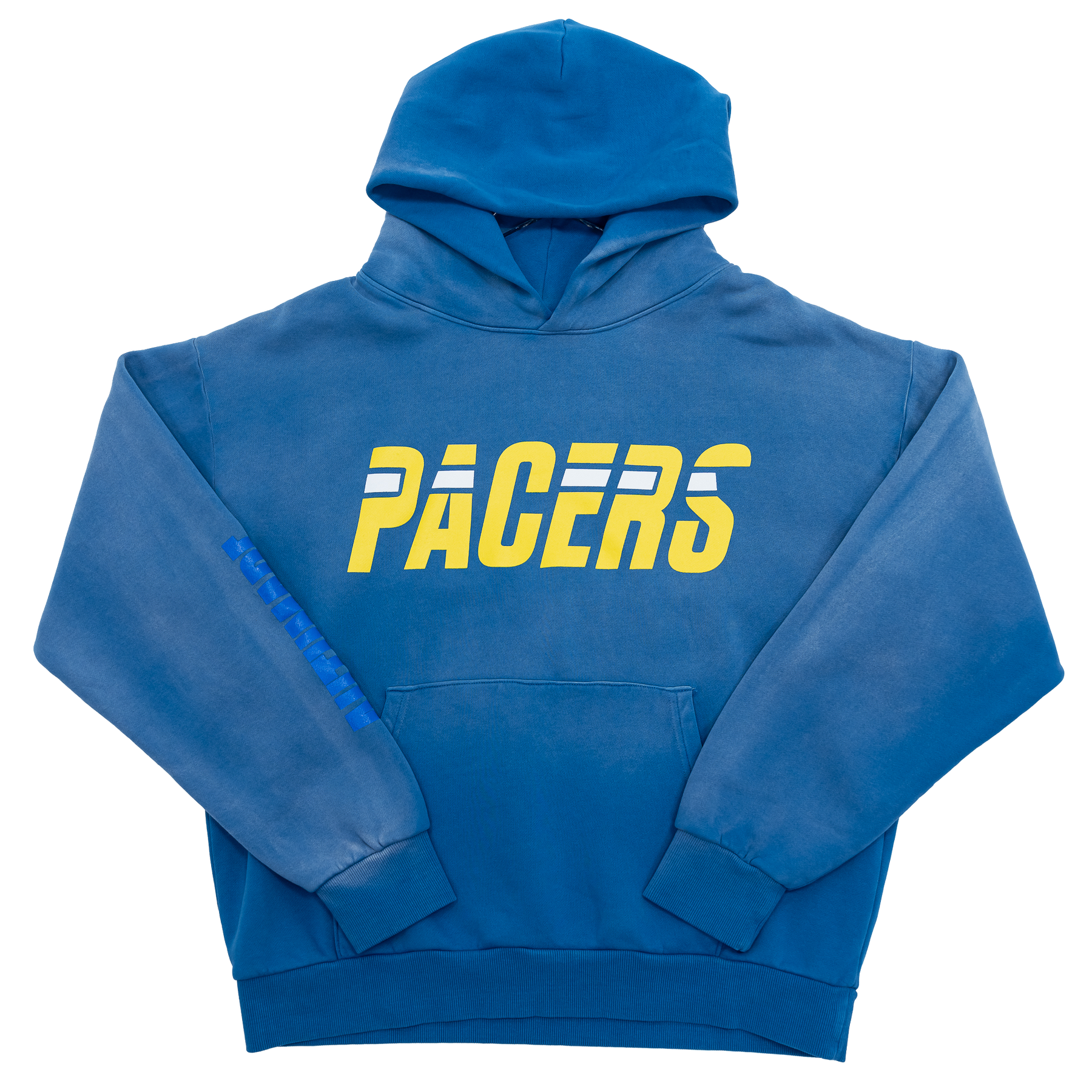 Blue hoodie with 'Pacers' text on a white background